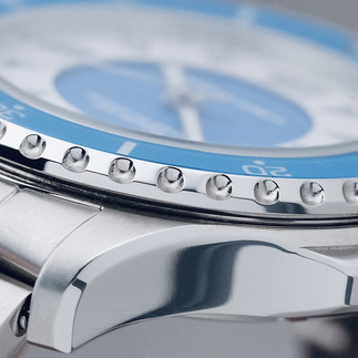 The minute hand for its part, also polished and diamond-cut, reaches beyond the blue window and white ring to almost rub against the plain brushed rehaut, and appears majestic on account of its impressive length compared to that of the hour hand. This contradiction in sizes behind the two principal hands is reminiscent of the more utilitarian-focused plongeur-style hands although disguised here by the elegance of the mirror-like polishing. The seconds hand is comparatively smaller and more discreet, as it is more important to tell the time to the precise hour and minute than to the atomic second. The aforementioned hour markers deserve to be further analyzed as they are part of a sandwich-dial construction (a lumed disc sits below the dial main) but differ from most such designs as each marker is emphasized and decorated by a polished frame. The Arabic numeral and triangular hour markers are therefore easy to see during the day as they are at night when the intensity of the lume shines through each hollowed out index.