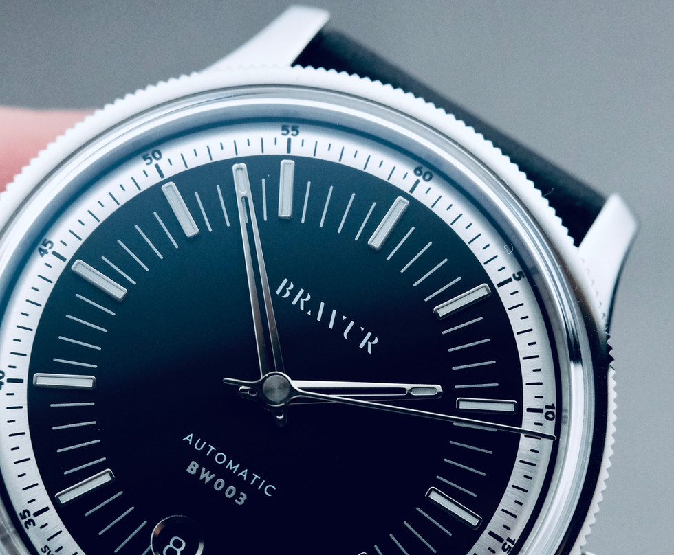 Somewhere in my lengthy introduction I mentioned the fact this watch looks unique, or should I say authentic. Here I am referring to the dual-tone dial that comes with a black center section and a silver outer section. The black section is where the applied hour markers and the painted minute hash marks live, while the silver section is where a fully graduated minute track exists, complete with Arabic numerals highlighting the five-minute increments. In a sense, the BW003 has a semi-sector design given its dual scales. Everything, however, works well together. I can’t stop looking at the elegant and harmonious dial design which comes with a strong personality. A bonus point goes to Bravur for integrating a circular and framed date aperture at the 6.