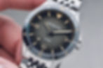 We do once again find lovely colors here: the crême brulée-colored vintage lume applied on the hands, hour markers, and bezel markings paint the whole watch with a vintage character. The shape of the Arabic numerals marking the 3, 6, and 9 conversely anchor the dial back into contemporary horology and give out whiffs of modern Rolex Explorer 1 on account of their height and width and polished metallic surrounds. The other hour markers are also of today’s watch world, shaped into inward-facing tapering rectangles and a large inverted triangle at the twelve o’clock, the latter making images of an Omega Seamaster 300 flash in front of my eyes. All markers are applied onto a deeply textured matte gray dial complemented by a fumé treatment which darkens at the edges, therefore below the markers making them stand out even more. (The contrast between the dial and cream lume is superb in my humble opinion.) Moreover, above the dial float skyscraper-shaped hour and minute hands made of upper brushed surfaces and two polished facets.