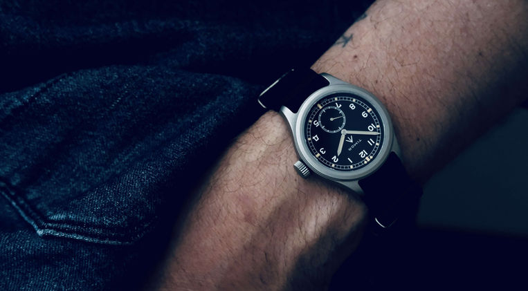 The case, for its part, is as simple as they come. As we know, the entire case is sandblasted which confers the W.W.W. a distinct utilitarian aspect. The fixed bezel has a two-step construction and integrates well with the slab-sided profile of the case sides. The lugs are long and thin and turn down dramatically, giving them the appearance of claws. The small crown sits flush against the case and is well-proportioned given the smaller case diameter. Following the purpose-driven nature of the W.W.W. and its heritage, text on the dial was kept to a minimum: the brand name and the Broad Arrow symbol—denoting its historical connection with the British Crown—under the 12.